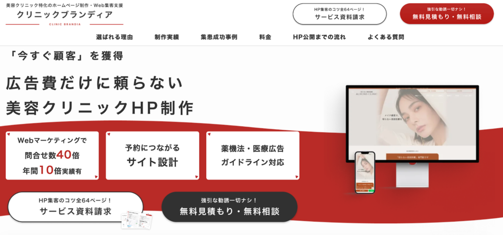 | クリニックブランディア(株式会社TENSEN) | ホームページ制作・SEO・広告 | 美容クリニック特化・「エリア名×施術名」のSEO対策に強く、問合せ数40倍・年間10倍の集客実績あり | 120万円〜 |