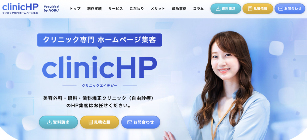 | clinicHP(株式会社NOBU) | ホームページ制作・SEO・MEO・LP・広告 | 自由診療特化・医療イラストを用いた「専門性を視覚化するデザイン」が強み | LP:40〜100万円 小規模サイト:100〜200万円 中規模サイト:200〜400万円 |