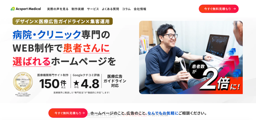 | Acsport Medical(株式会社Acsport) | ホームページ・SEO・MEO・SNS・広告 | 医療DX専門チーム・予約導線の最適化でフォーム到達率40%以上改善 | 初期費用:70万円〜 運用:月額2万円〜 |