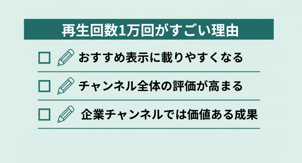 特にBtoB企業やニッチな専門分野を扱う企業にとって、1万回再生は非常に価値のある成果です。