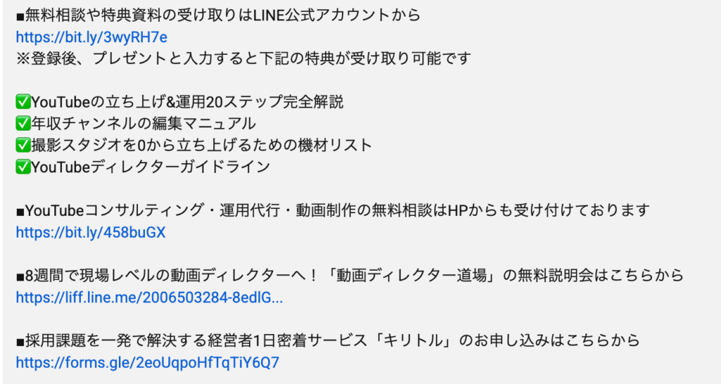 また、概要欄の冒頭には、問い合わせフォームや資料請求ページへのリンクを配置し、視聴者が迷わず行動できるようにします。
