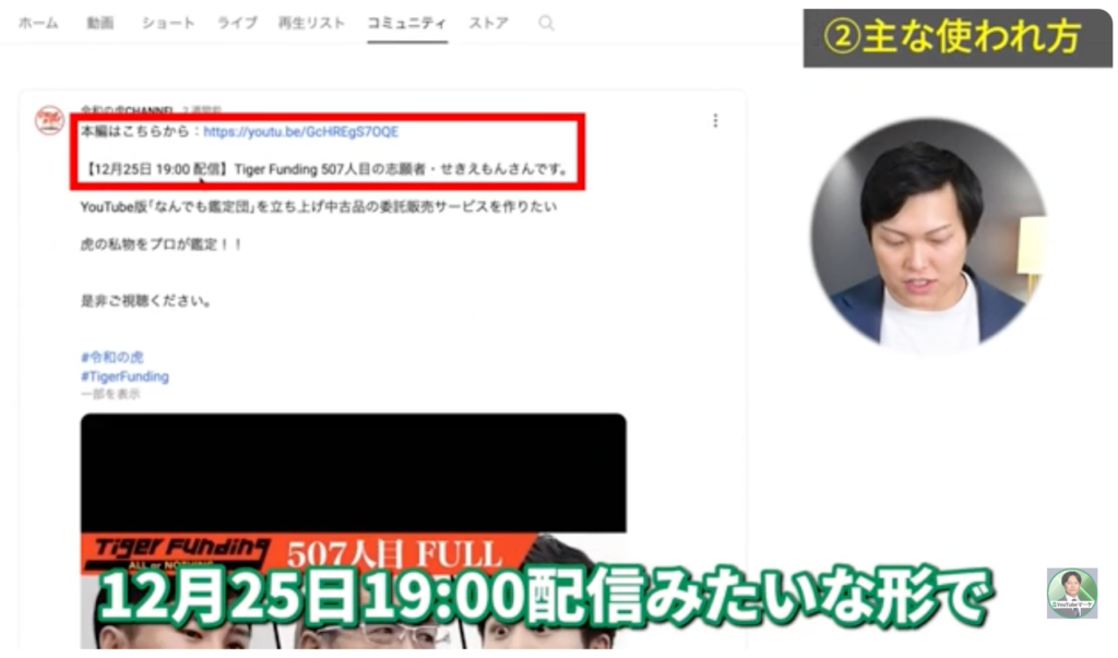 | インフルエンサーとコラボする場合 | 相手にコミュニティ投稿での紹介を依頼 | 相手の視聴者を自社チャンネルへ流入 |